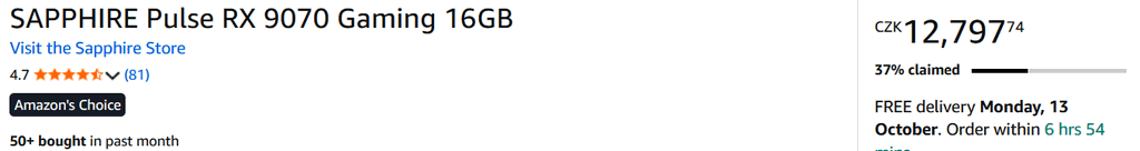 O 1000 Kč levněji než v ČR můžete také pořídit tuto solidní RX 9070, která je o něco výkonnější a má o 4GB VRAM více než RTX 5070…